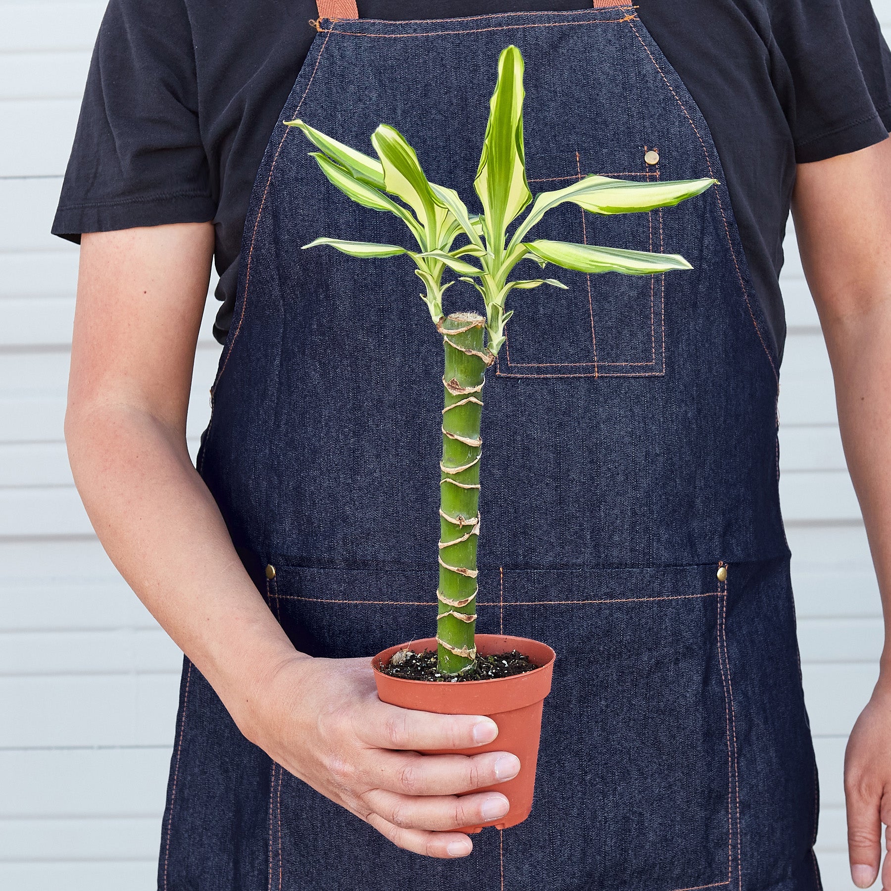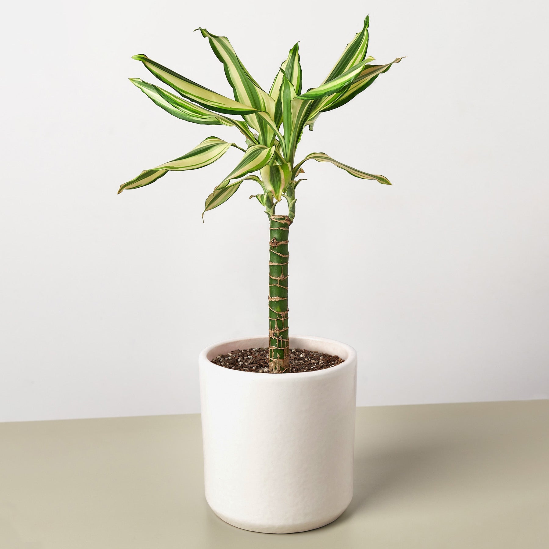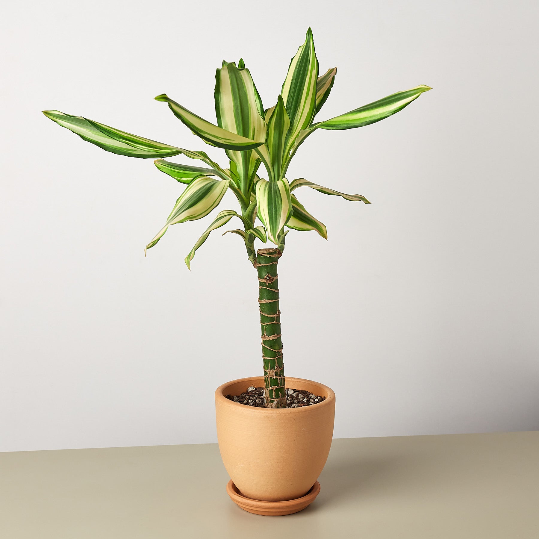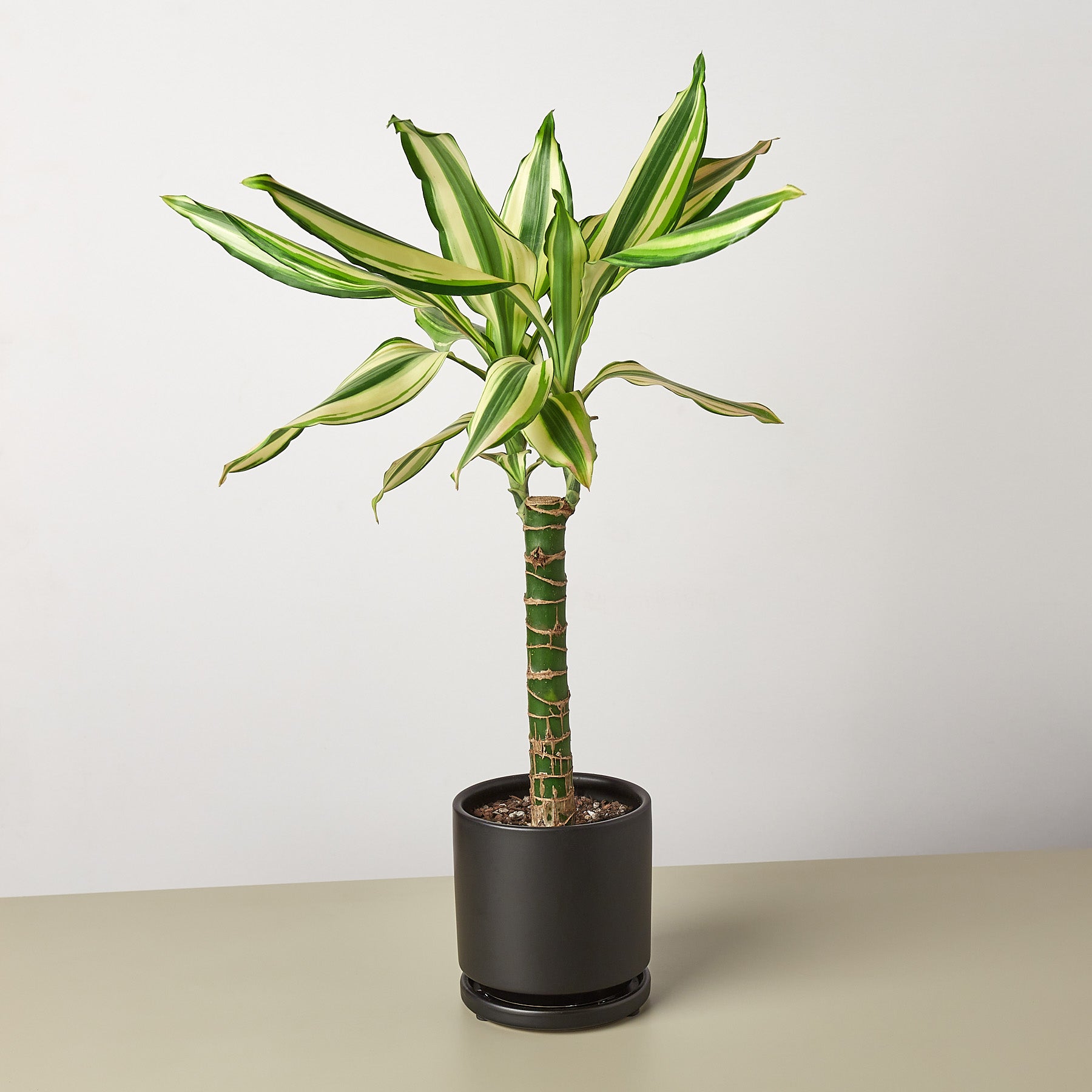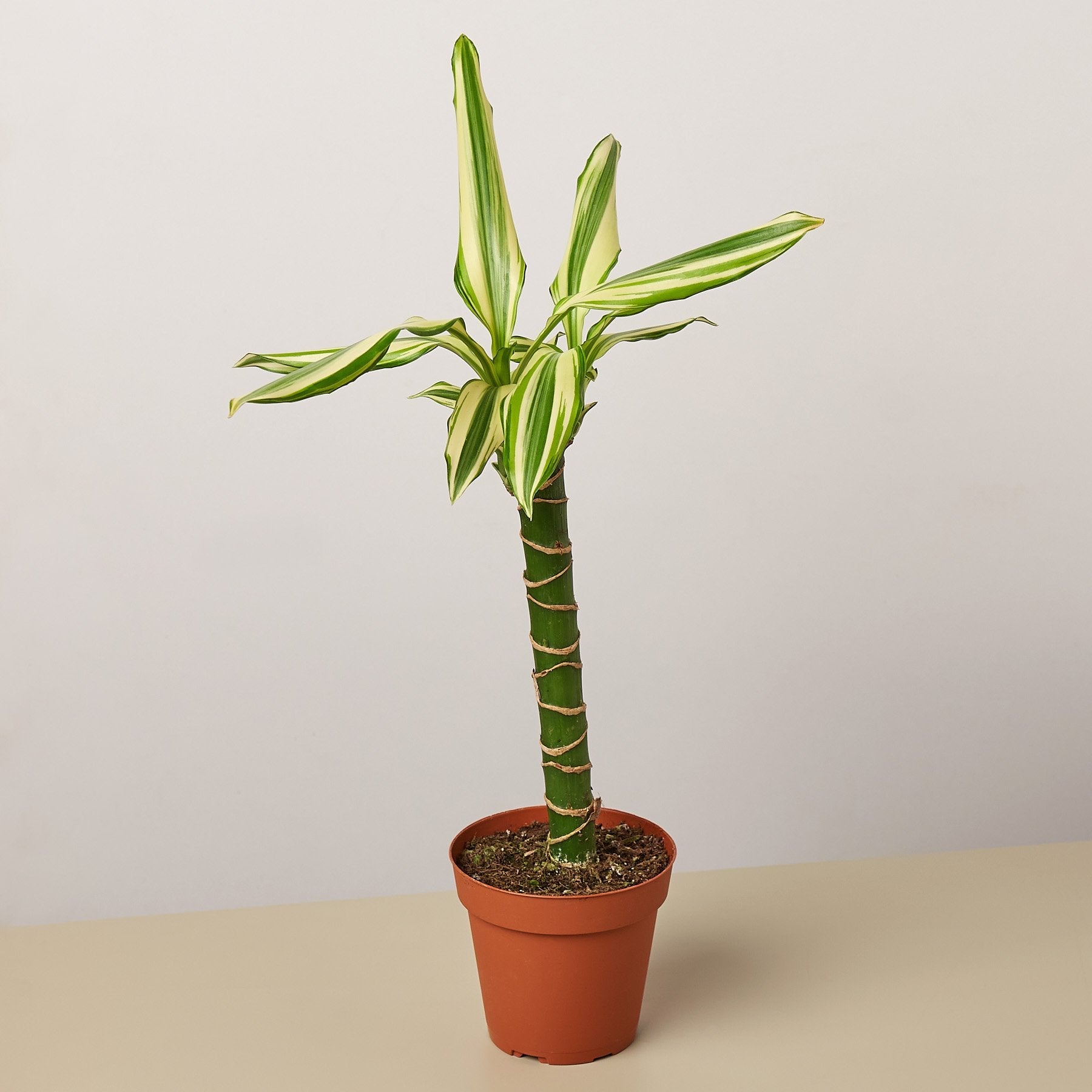 - Description: A member of the Dracaena family, this durable plant can easily be mistaken for a palm plant. This care-free plant is a strong upright, evergreen shrub with a stout tan stem topped by a rosette on long, sword-shaped leaves. Narrow and arching, the shiny leaves are striped with golden-yellow down their center. It thrives in a large range of environments and is great for adding a tropical appearance to any room.