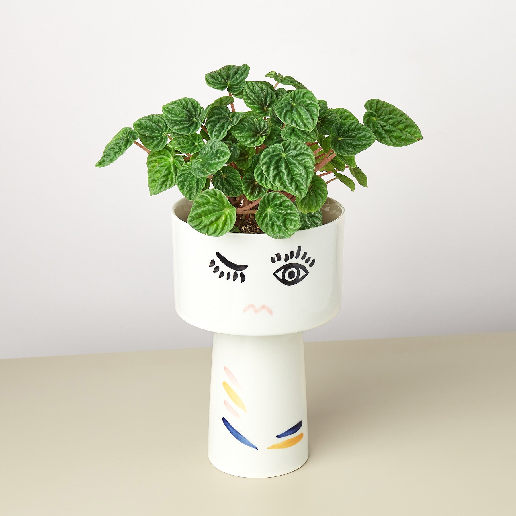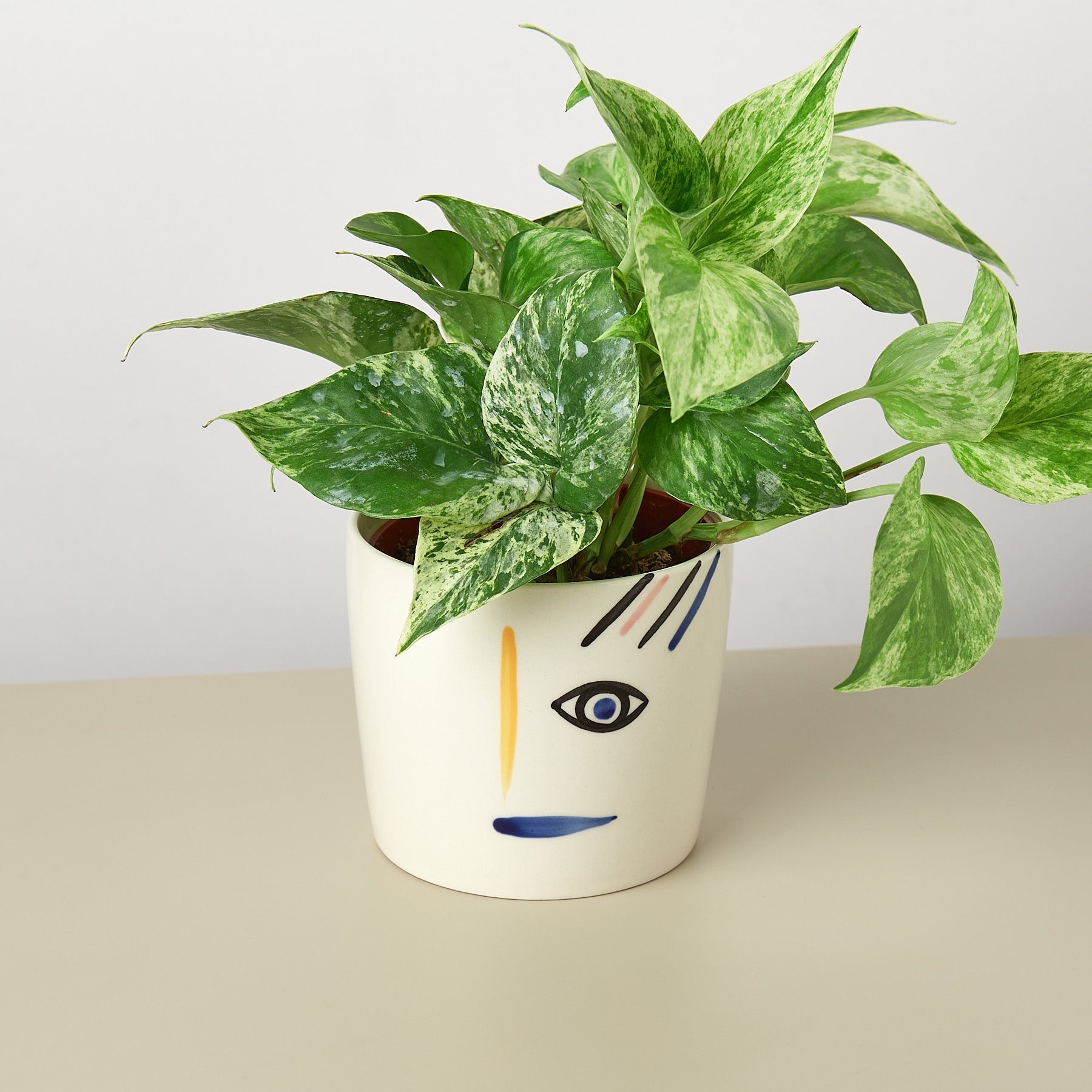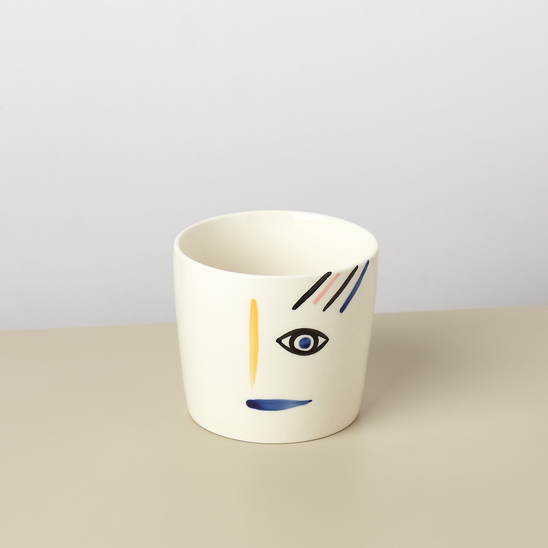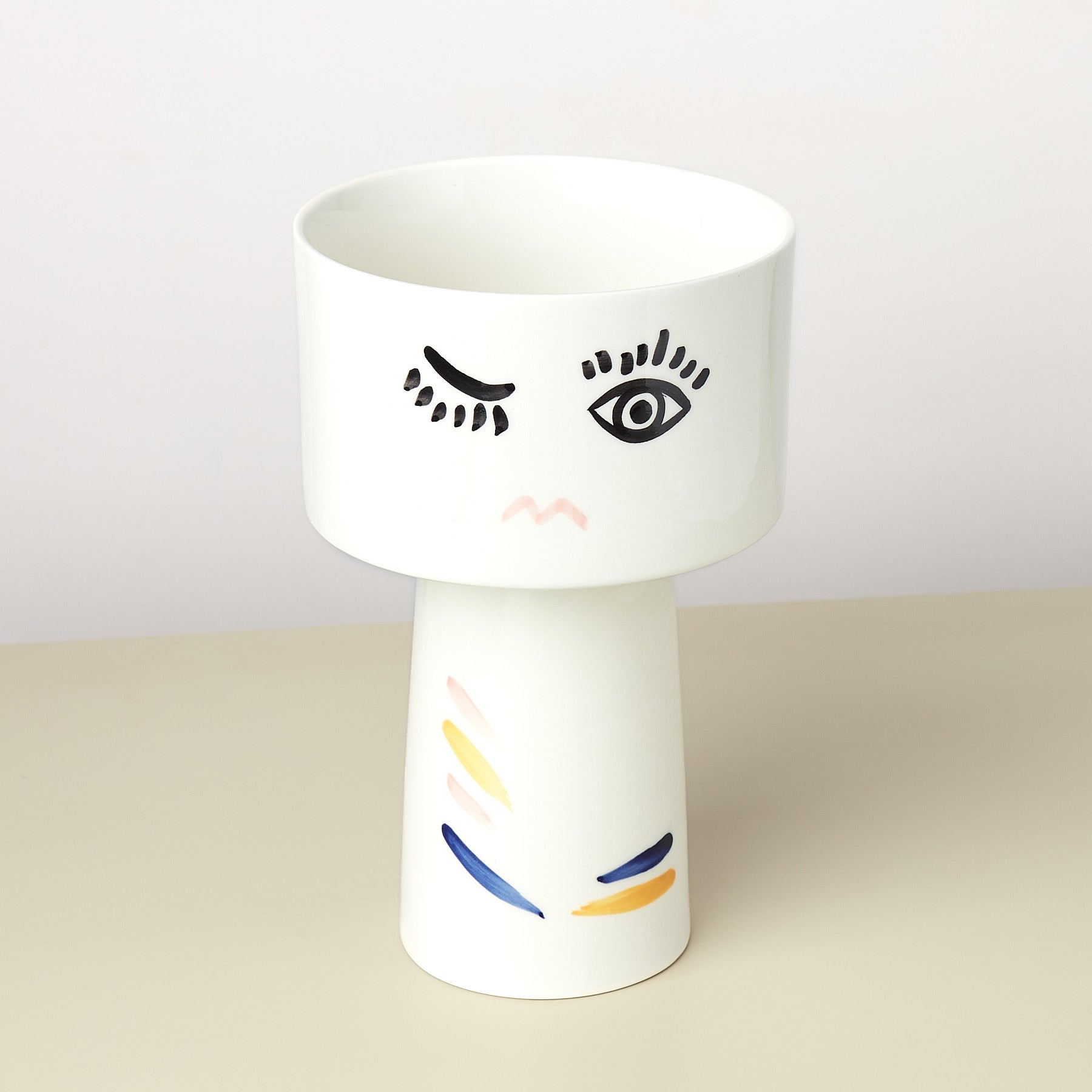 This expressive stoneware pot features a simple silhouette, and hand-painted designs both whimsical and iconic.