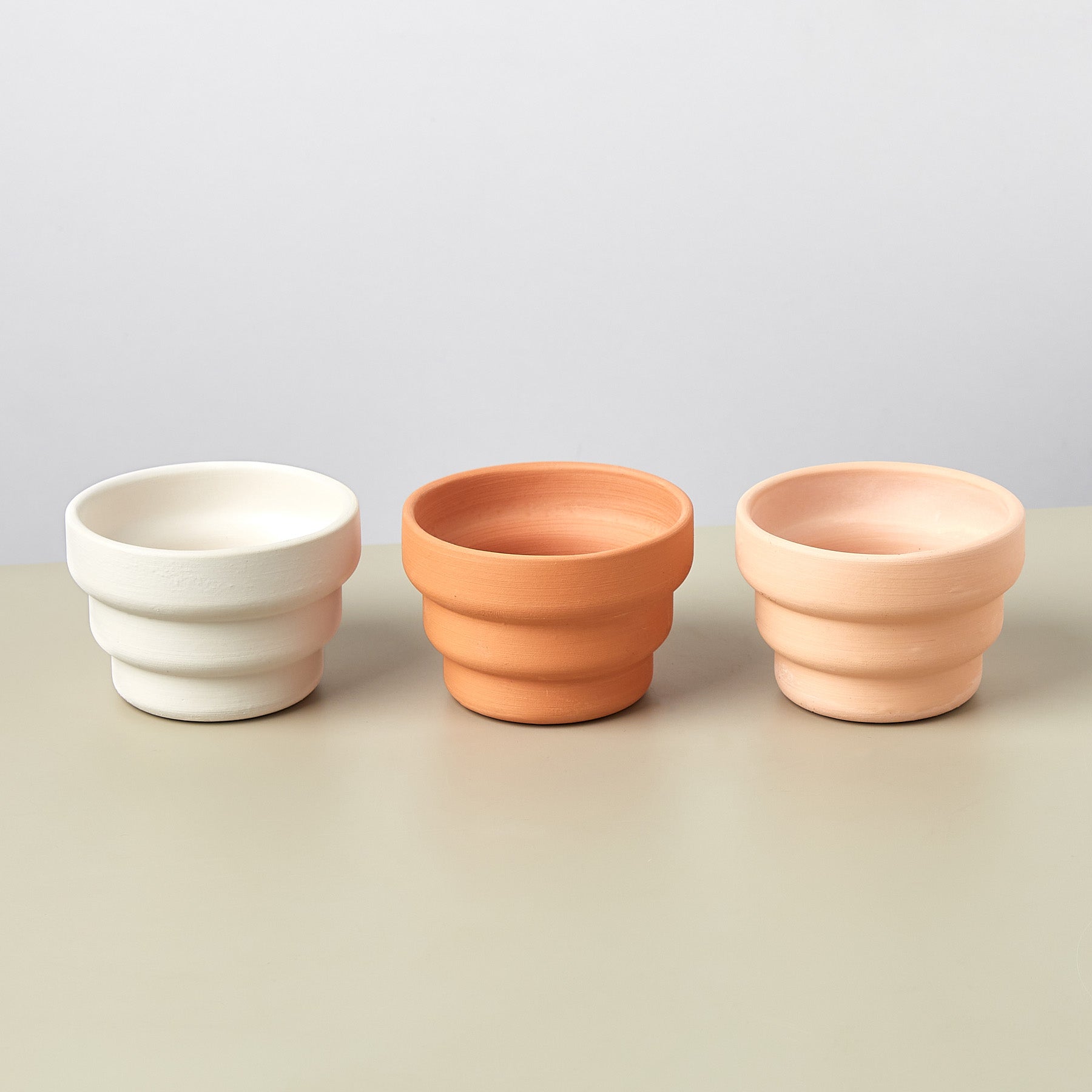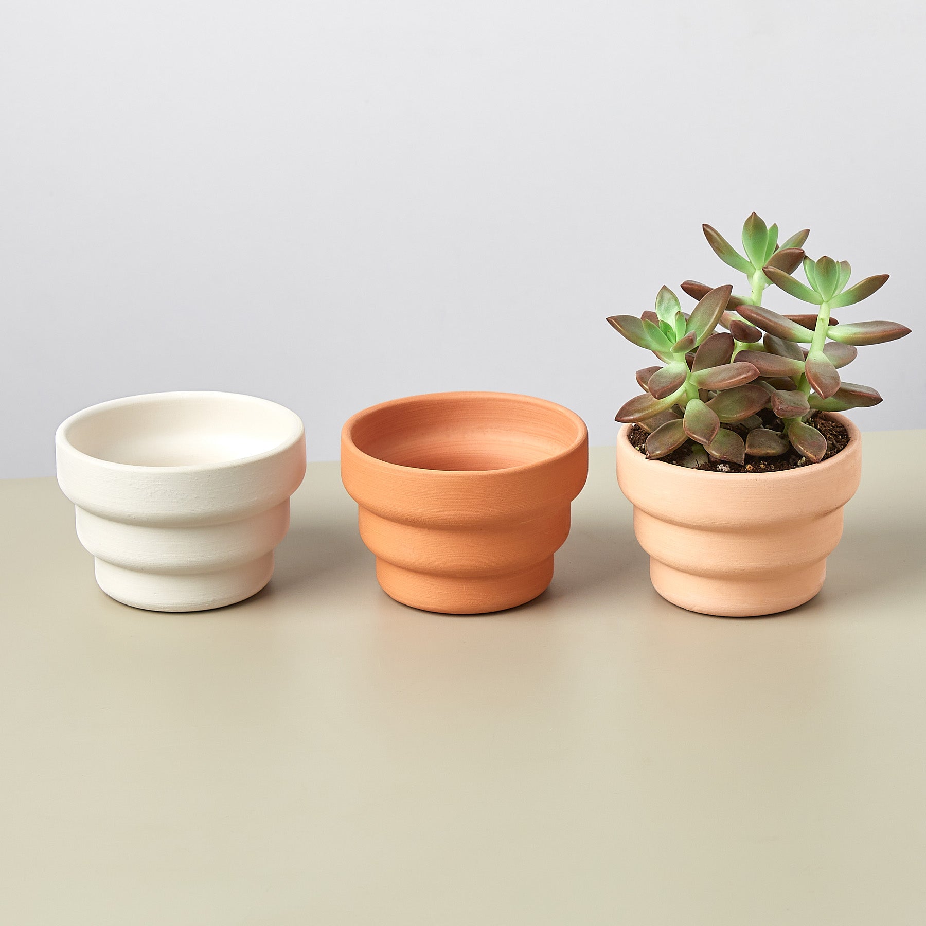 Small modern handmade ceramic planter in a raw, unglazed earthenware clay. There are three color options available: White, Pink Ecru, and Terracotta. The planter includes a drainage hole and is the perfect size for a small succulent or cactus! A plant listed as 2" or 4" by the seller should fit nicely in this planter size.