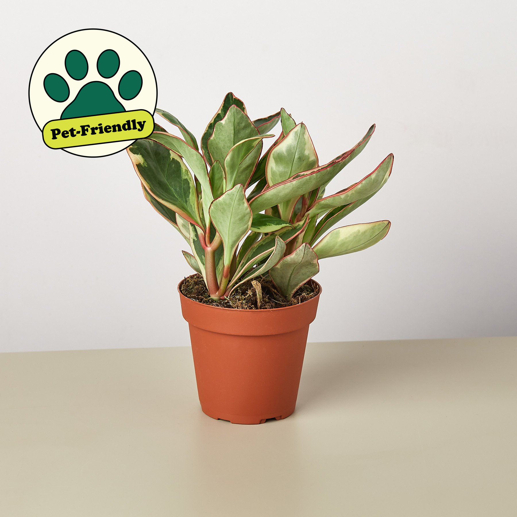 - Description: The Ginny is compact tropical plant variegated oval-shaped leaves with red edges. Peperomias are very low maintenance as its thick leaves retain large amounts of water.
